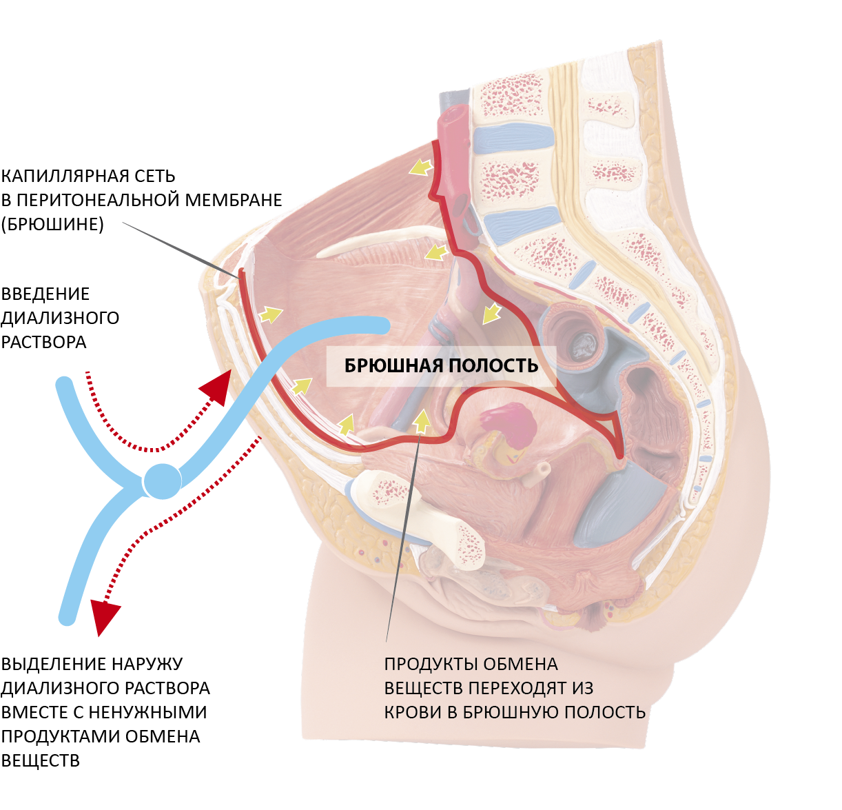 При перитонеальном диализе роль мембраны, через которую из организма выводятся шлаки и излишек жидкости, выполняет брюшина — естественная облочка, выстилающая изнутри брюшную полость.